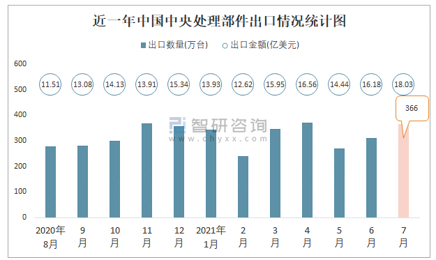 根據(jù)中國海關數(shù)據(jù)顯示:2021年7月中國中央處理部件進口數(shù)量為103萬臺,同比增長58.9%,進口金額為2.49億美元,同比增長80.7%,2021年7月中國中央處理部件出口數(shù)量為366萬臺,同比增長26.6%,出口金額為18.03億美元,同比增長45.8%;2021年1-7月中國中央處理部件進口數(shù)量為725萬臺,進口金額為17.75億美元,出口數(shù)量為2248萬臺,出口金額為107.71億美元。