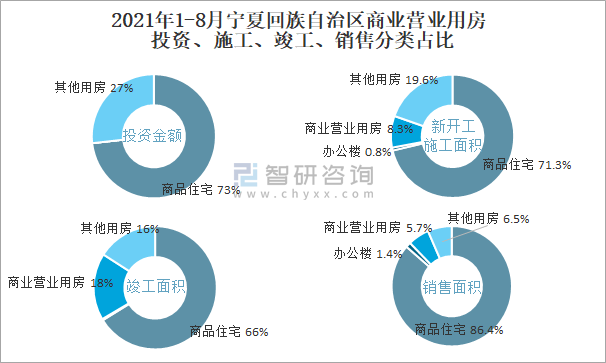 根據國家統計局數據統計可知:2021年1-8月寧夏回族自治區房地產開發企業在包括商業營業用房在內的其他用房投資金額占比為26.8%(注:只有投資金額中其他用房包含辦公樓、商業營業用房),商業營業用房的新開工面積與竣工面積所占比重差異不大,從銷售面積來看,商業營業用房銷售面積占比高于辦公樓銷售面積占比。