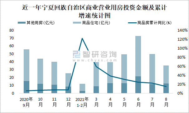 根據國家統計局數據統計可知:2021年8月寧夏回族自治區房地產開發投資商品房投資金額為35.37億元,其中包括辦公樓、商業營業用房等其他用房12.49億元(注:辦公樓、商業營業用房未分開統計);2021年1-8月寧夏回族自治區房地產開發投資包括商業營業用房在內的其他用房累計金額為82.72億元。