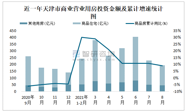 根據(jù)國家統(tǒng)計(jì)局?jǐn)?shù)據(jù)統(tǒng)計(jì)可知:2021年8月天津市房地產(chǎn)開發(fā)投資商品房投資金額為193.65億元,其中包括辦公樓、商業(yè)營業(yè)用房等其他用房46.12億元(注:辦公樓、商業(yè)營業(yè)用房未分開統(tǒng)計(jì));2021年1-8月天津市房地產(chǎn)開發(fā)投資包括商業(yè)營業(yè)用房在內(nèi)的其他用房累計(jì)金額為430.32億元。
