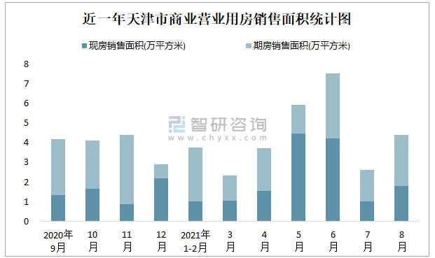 根據(jù)國家統(tǒng)計(jì)局?jǐn)?shù)據(jù)可知:2021年8月天津市商業(yè)營業(yè)用房銷售面積為4.38萬平方米(其中銷售現(xiàn)房1.78萬平方米,期房2.6萬平方米);2021年1-8月天津市商業(yè)營業(yè)用房累計(jì)銷售面積為30.27萬平方米;近一年天津市商業(yè)營業(yè)用房期房銷售面積遠(yuǎn)高于現(xiàn)房銷售面積。