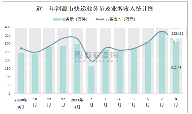 近一年河源市快遞業(yè)務(wù)量及業(yè)務(wù)收入統(tǒng)計(jì)圖