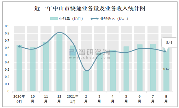 2021年8月中山市快遞業務量與業務收入分別為6205.19萬件和54600.04萬元