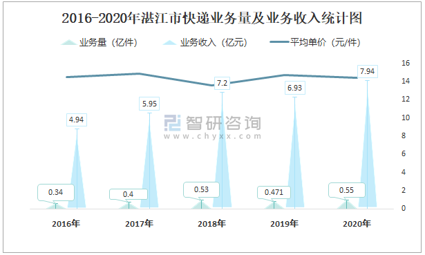 2016-2020年湛江市快遞業(yè)務(wù)量及業(yè)務(wù)收入統(tǒng)計(jì)圖
