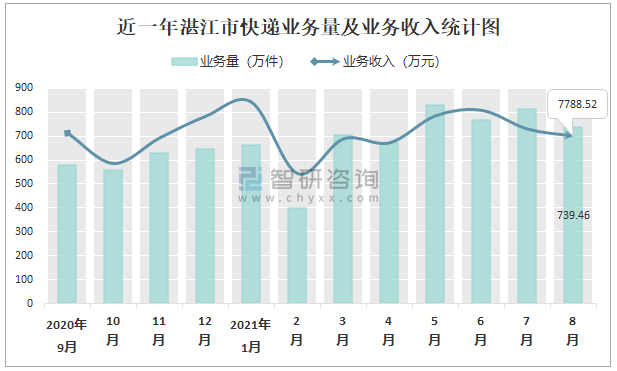 近一年湛江市快遞業(yè)務(wù)量及業(yè)務(wù)收入統(tǒng)計(jì)圖