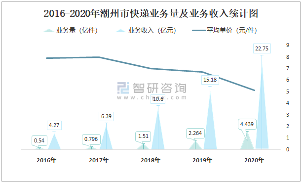 2016-2020年潮州市快遞業務量及業務收入統計圖