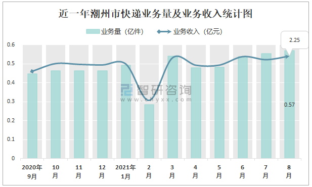 根據各省市郵政局數據可知:2021年8月潮州市快遞業務量占廣東快遞業務量的2.26%,廣東快遞業務量占全國快遞業務量的28.85%;2021年8月潮州市快遞業務收入占廣東快遞業務收入的1.12%,廣東快遞業務收入占全國快遞業務收入的24.5%。