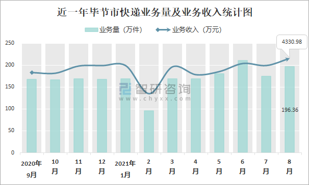 2021年8月畢節市快遞業務量與業務收入分別為196.36萬件和4330.98萬元