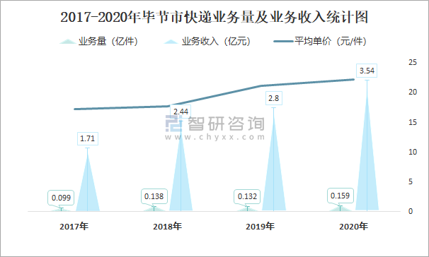 2017-2020年畢節市快遞業務量及業務收入統計圖