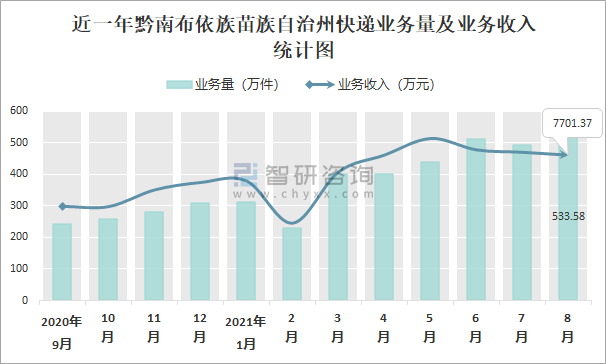 2021年8月黔南布依族苗族自治州快遞業務量與業務收入分別為533.58萬件和7701.37萬元