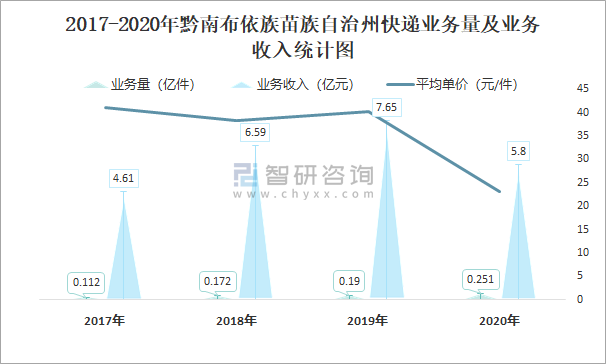 2017-2020年黔南布依族苗族自治州快遞業務量及業務收入統計圖