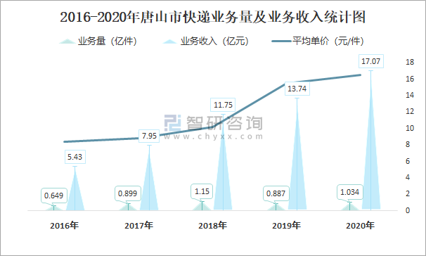 2016-2020年唐山市快遞業(yè)務量及業(yè)務收入統(tǒng)計圖