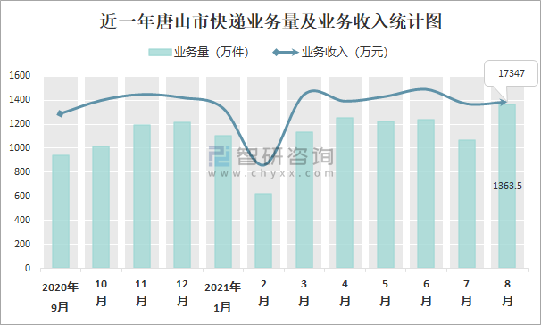 2021年8月唐山市快遞業(yè)務量與業(yè)務收入分別為1363.5萬件和17347萬元