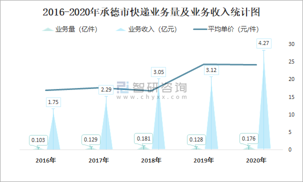 2016-2020年承德市快遞業務量及業務收入統計圖