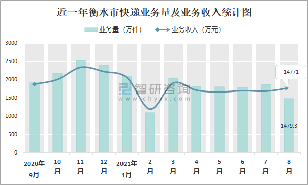 近一年衡水市快遞業務量及業務收入統計圖