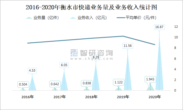 2016-2020年衡水市快遞業務量及業務收入統計圖