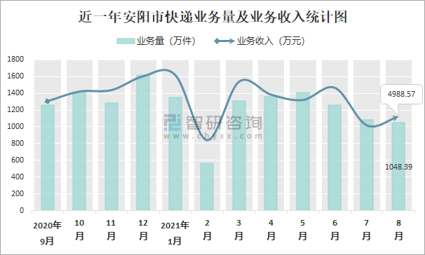 2021年8月安陽市快遞業務量與業務收入分別為1048.39萬件和4988.57萬元