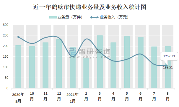 近一年鶴壁市快遞業(yè)務(wù)量及業(yè)務(wù)收入統(tǒng)計圖