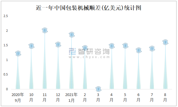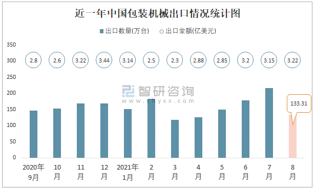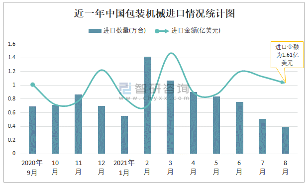 根據中國海關數據顯示:2021年8月中國包裝機械進口數量為0.39萬臺,同比下降92.4%,進口金額為1.61億美元,同比增長48.4%,2021年8月中國包裝機械出口數量為133.31萬臺,同比下降12%,出口金額為3.22億美元,同比增長17.8%;2021年1-8月中國包裝機械進口數量為6.32萬臺,進口金額為12.67億美元,出口數量為1238.27萬臺,出口金額為23.26億美元。