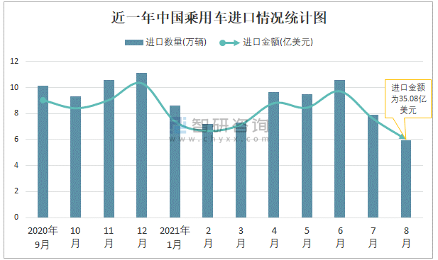 根據中國海關數據顯示:2021年8月中國乘用車進口數量為5.94萬輛,同比下降28.3%,進口金額為35.08億美元,同比下降12.5%,2021年8月中國乘用車出口數量為16.71萬輛,同比增長154.9%,出口金額為26.15億美元,同比增長277.3%;2021年1-8月中國乘用車進口數量為66.67萬輛,進口金額為360.42億美元,出口數量為100.55萬輛,出口金額為137.88億美元。