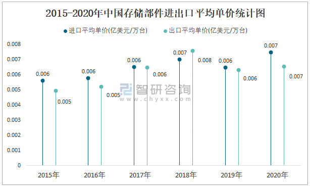 2015-2020年中國存儲部件進出口平均單價統計圖
