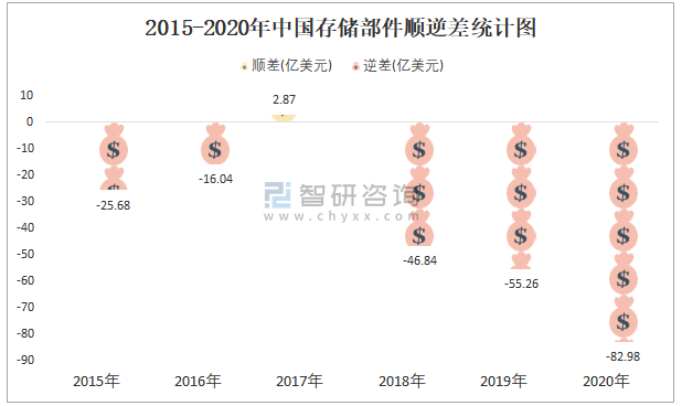 2015-2020年中國存儲部件順逆差(億美元)統計圖