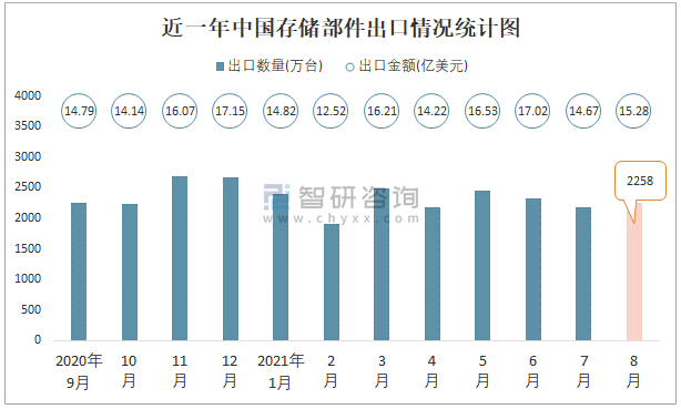 近一年中國存儲部件出口情況統計圖