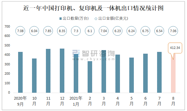 2021年8月中國打印機、復印機及一體機進出口數量分別為101.55萬臺和412.34萬臺