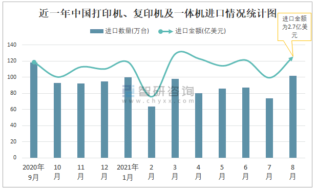 根據中國海關數據顯示:2021年8月中國打印機、復印機及一體機進口數量為101.55萬臺,同比下降17.2%,進口金額為2.7億美元,同比增長10.4%,2021年8月中國打印機、復印機及一體機出口數量為412.34萬臺,同比下降1.3%,出口金額為7.06億美元,同比增長11%;2021年1-8月中國打印機、復印機及一體機進口數量為689.46萬臺,進口金額為19.48億美元,出口數量為3212.91萬臺,出口金額為53.24億美元。