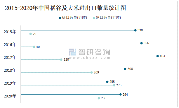 2015-2020年中國稻谷及大米進出口數量統計圖