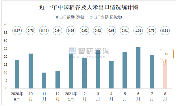 根據中國海關數據顯示:2021年8月中國稻谷及大米進口數量為36萬噸,同比增長167.6%,進口金額為1.44億美元,同比增長140%,2021年8月中國稻谷及大米出口數量為18萬噸,同比增長49.7%,出口金額為0.61億美元,同比增長30.5%;2021年1-8月中國稻谷及大米進口數量為320萬噸,進口金額為14.73億美元,出口數量為169萬噸,出口金額為6.45億美元。