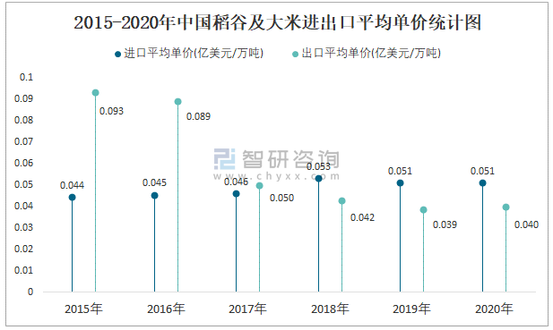 2015-2020年中國稻谷及大米進出口平均單價統計圖