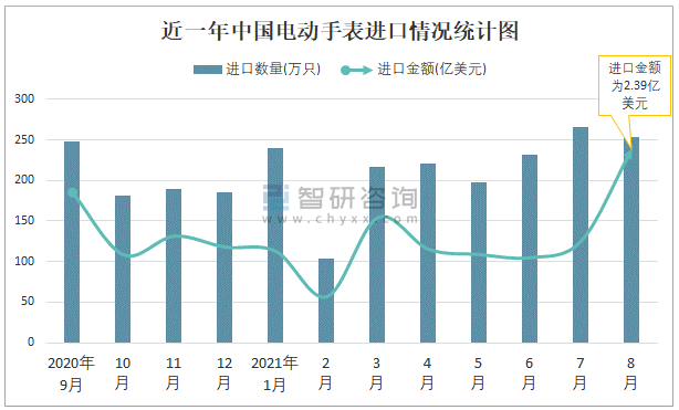 根據中國海關數據顯示:2021年8月中國電動手表進口數量為253萬只,同比增長61.1%,進口金額為2.39億美元,同比增長157.6%,2021年1-8月中國電動手表進口數量為1731萬只,進口金額為10.19億美元。