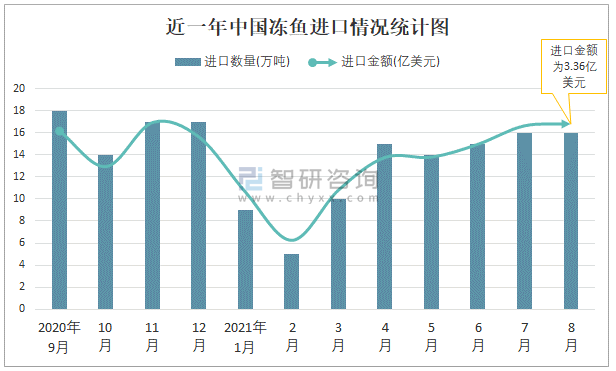 根據中國海關數據顯示:2021年8月中國凍魚進口數量為16萬噸,同比增長56.1%,進口金額為3.36億美元,同比增長76.6%,2021年1-8月中國凍魚進口數量為101萬噸,進口金額為20.7億美元。