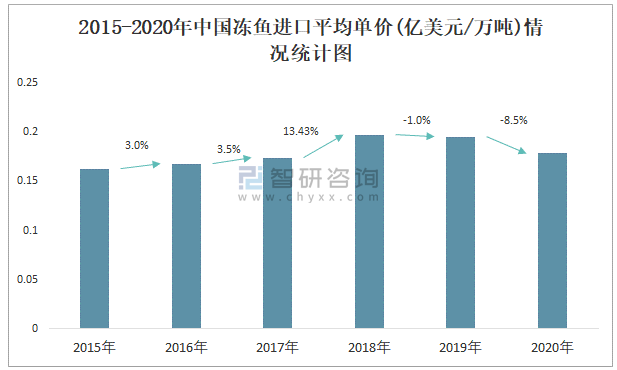 根據中國海關數據顯示:2015-2020年中國凍魚進口數量與進口金額均在2019年達到最高值,此后小幅度下滑;2015-2020年中國凍魚進口平均單價2018年增長速度最快,而2020年中國凍魚進口平均單價下降速度最快,下滑了8.5%。