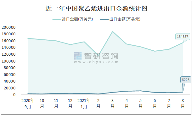 近一年中國聚乙烯進(jìn)出口金額統(tǒng)計(jì)圖