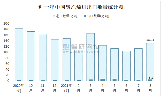 根據(jù)中國石油和化學(xué)工業(yè)聯(lián)合會(huì)數(shù)據(jù)顯示:2021年8月中國聚乙烯進(jìn)口數(shù)量為131.1萬噸,出口數(shù)量為5.1萬噸;進(jìn)口金額為154337萬美元,出口金額為8225萬美元;近一年中國聚乙烯出口總金額小于進(jìn)口總金額,貿(mào)易逆差為主,8月進(jìn)口均價(jià)1177美元/噸。