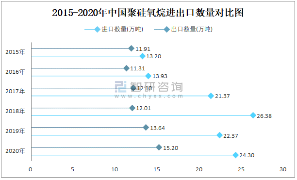 2015-2020年中國聚硅氧烷進(jìn)出口數(shù)量對比統(tǒng)計圖
