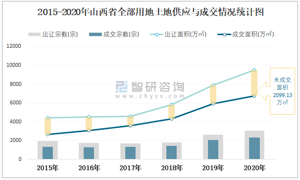 2015-2020年山西省全部用地土地供應(yīng)與成交情況統(tǒng)計(jì)圖