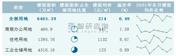 根據國信房地產信息網數據統計可知:2021年9月內蒙古自治區全部用地出讓地面均價為434元/㎡,其中住宅用地出讓地面均價最高(2600元/㎡),全部用地成交地面均價為428元/㎡,其中住宅用地成交地面均價為2119元/㎡,高于商服辦公用地成交地面均價;2021年1-9月內蒙古自治區工業倉儲用地樓面面積占其全部用地比重最多,為66.55%,溢價率為0.89%。