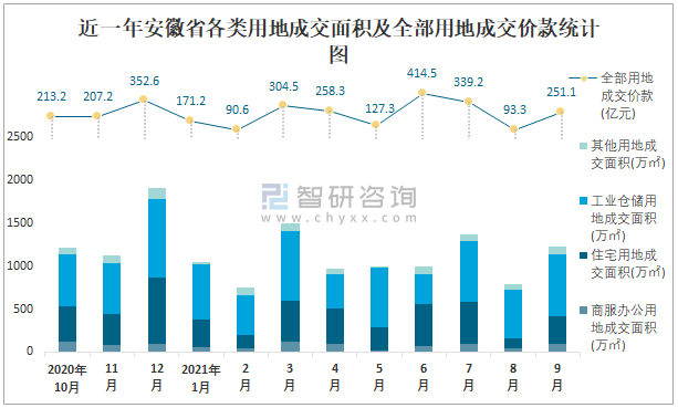 近一年安徽省各類用地成交面積及全部用地成交價款統計圖