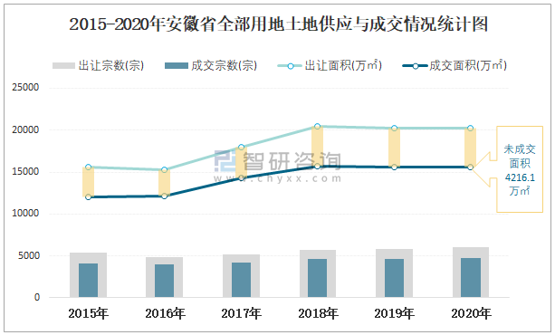 2015-2020年安徽省全部用地土地供應與成交情況統計圖