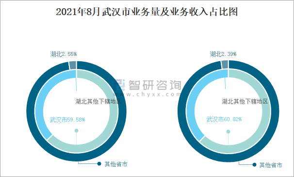 根據各省市郵政局數據可知:2021年8月武漢市快遞業務量占湖北快遞業務量的59.58%,湖北快遞業務量占全國快遞業務量的2.55%;2021年8月武漢市快遞業務收入占湖北快遞業務收入的60.82%,湖北快遞業務收入占全國快遞業務收入的2.39%。