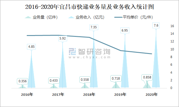 2016-2020年宜昌市快遞業務量及業務收入統計圖