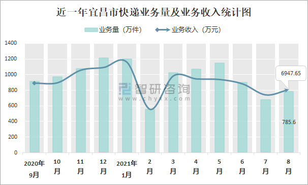 近一年宜昌市快遞業務量及業務收入統計圖