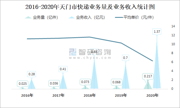 2016-2020年天門市快遞業(yè)務(wù)量及業(yè)務(wù)收入統(tǒng)計圖