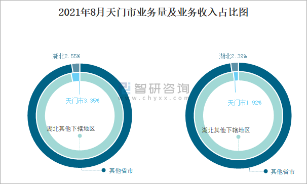 2021年8月天門市業(yè)務(wù)量及業(yè)務(wù)收入占比圖