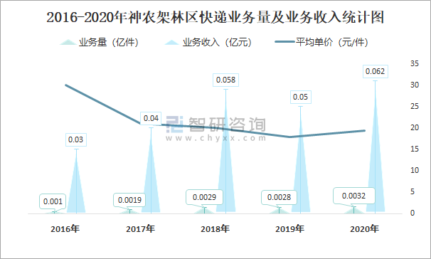 2016-2020年神農架林區快遞業務量及業務收入統計圖