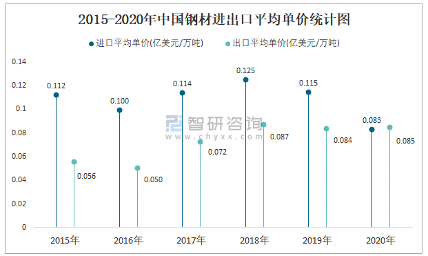 2015-2020年中國鋼材進出口平均單價統計圖