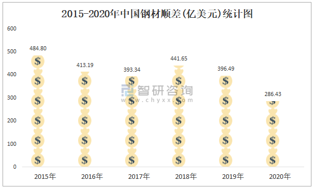 2015-2020年中國鋼材順差(億美元)統計圖